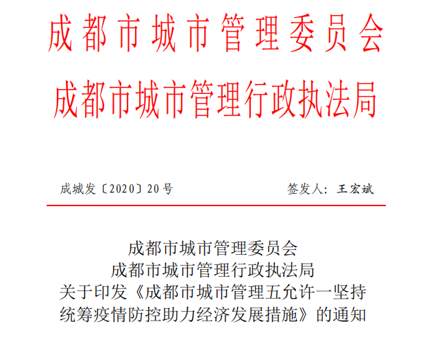 现将《成都市城市管理五允许一坚持统筹疫情防控助力经济发展措施》印发你们,请结合工作实际,认真贯彻执行。