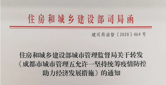 住房和城乡建设部城市管理监督局关于转发《成都市城市管理五允许一坚持统筹疫情防控助力经济发展措施》的通知