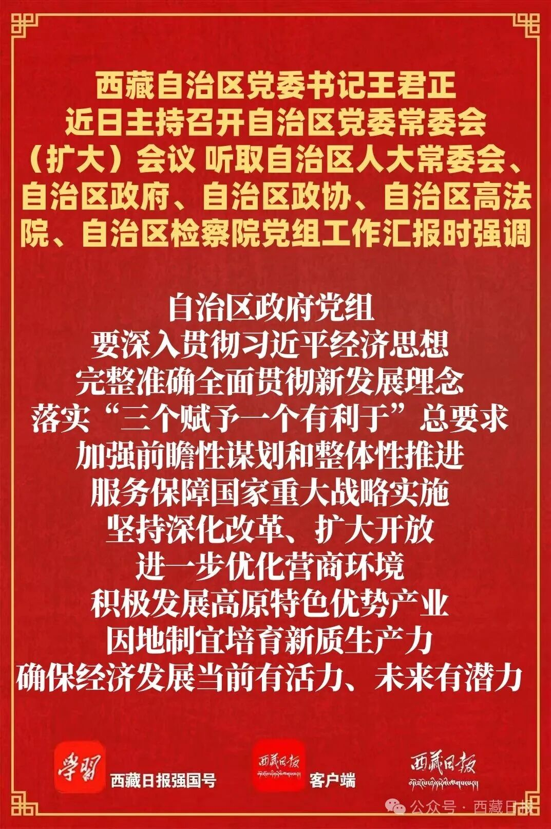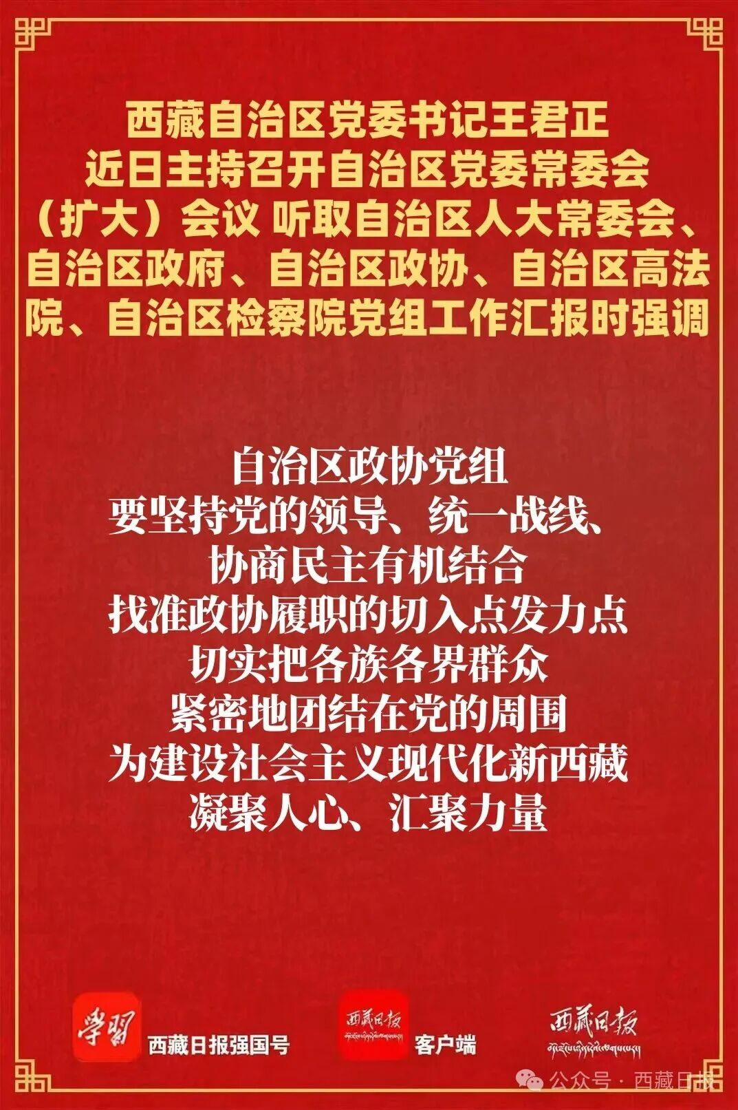 王君正强调,开局关乎全局、起步决定后程,做好2026年工作意义重大。各党组要在以习近平同志为核心的党中央坚强领导下,在自治区党委的团结带领下,统一意志、形成合力,充分发挥把方向、管大局、保落实的领导作用,聚焦四件大事聚力四个创建,坚定履行职责使命,切实发挥职能作用,努力实现十五五良好开局。自治区人大常委会党组要坚持党的领导、人民当家作主、依法治国有机统一,提高立法质量,努力把西藏经济社会发展过程中形成的好经验、好做法上升为规律性认识,通过制度形式固定下来,推动西藏工作规范化、科学化、法治化;提高监督效能,在全面监督、重点监督上下功夫,增强监督针对性实效性,加强和改进代表工作,提升代表履职能力。自治区政府党组要深入贯彻习近平经济思想,完整准确全面贯彻新发展理念,落实三个赋予一个有利于总要求,加强前瞻性谋划和整体性推进,服务保障国家重大战略实施,坚持深化改革、扩大开放,进一步优化营商环境,积极发展高原特色优势产业,因地制宜培育新质生产力,确保经济发展当前有活力、未来有潜力。自治区政协党组要坚持党的领导、统一战线、协商民主有机结合,找准政协履职的切入点发力点,切实把各族各界群众紧密地团结在党的周围,为建设社会主义现代化新西藏凝聚人心、汇聚力量。自治区高法院、自治区检察院党组要贯彻落实习近平法治思想,忠实履行法律赋予的职责使命,全面提高司法服务质量,不断提升履职能力和水平,为长治久安和高质量发展作出更大贡献。